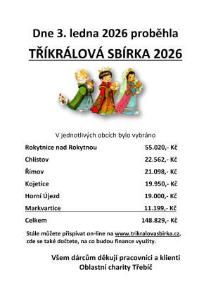 V sobotu 3. 1. 2026 se v naší obci uskutečnila TŘÍKRÁLOVÁ SBÍRKA. V Rokytnici se vybralo 55.020,- Kč. Dohromady s okolními obcemi vybraná částka činí 148.829,- Kč. Všem zúčastněným děkujeme.